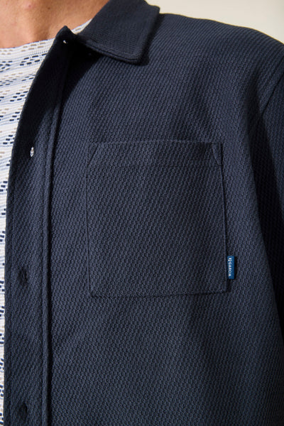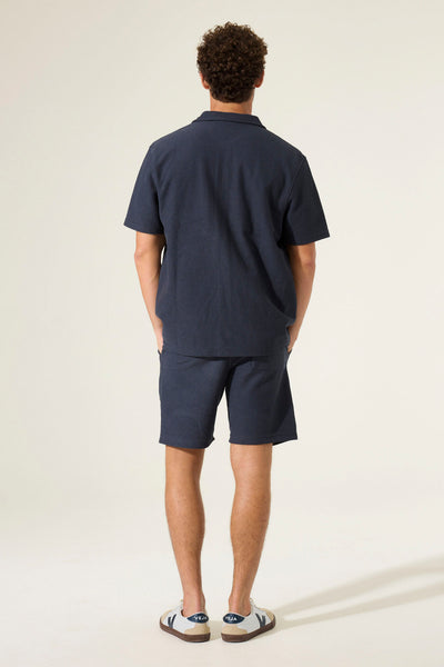 Man wearing a navy short-sleeve shirt over a patterned shirt with navy shorts on a white background