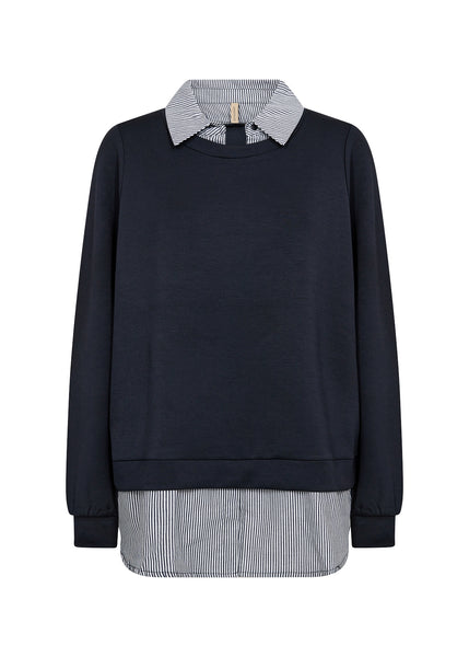 Women wearing a navy sweater with a faux navy and white blouse underneath.