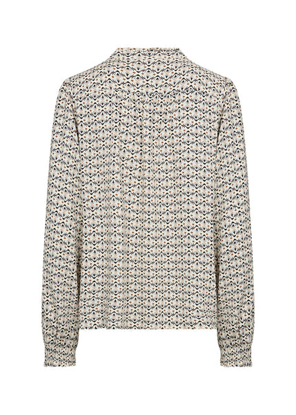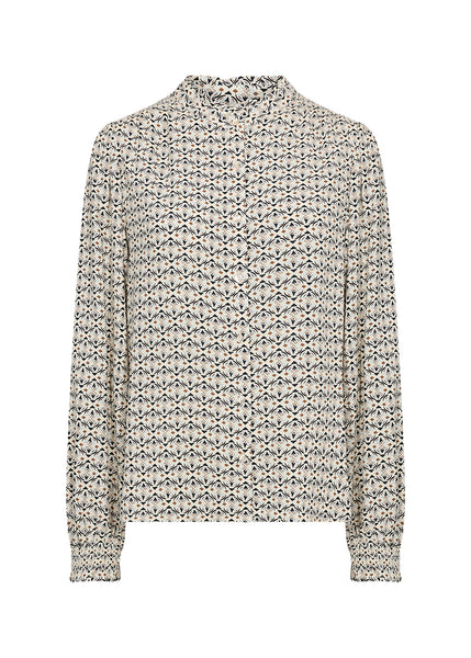 BELLUA 2 is an elegant shirt includes a mandarin collar, front button closure, a geometric print and long sleeves that end in ruffled cuffs. Pair it with tailored trousers for a professional look.