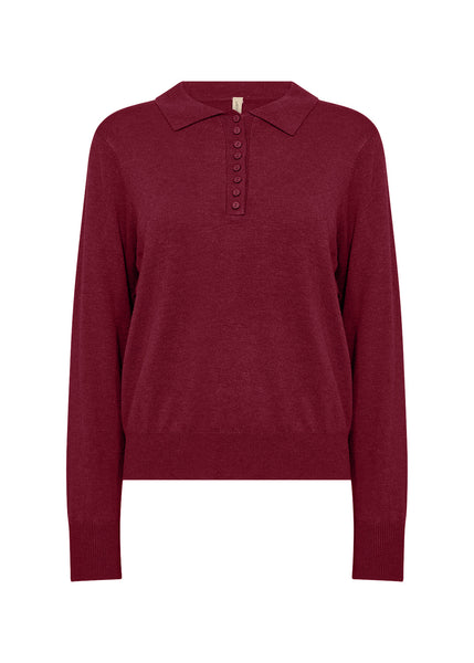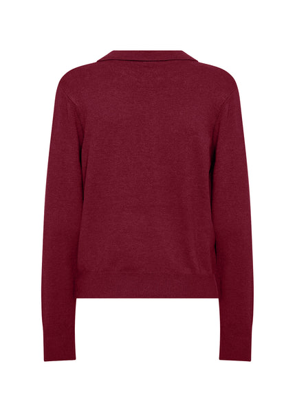 Dark red pullover with a classic collar with a button-up detail and ribbed cuffs.