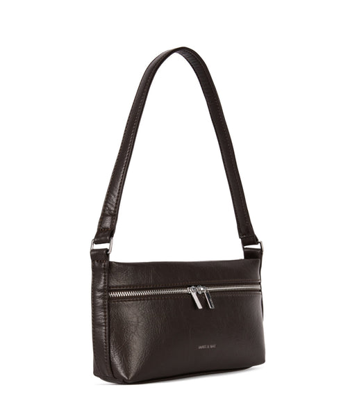A small brown shoulder bag with a top zipper closure and a front two-way zipper pocket