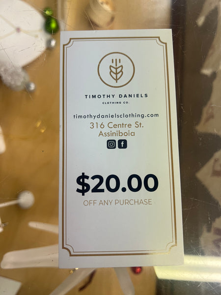 • $20.00 gift to TIMOTHY DANIELS CLOTHING