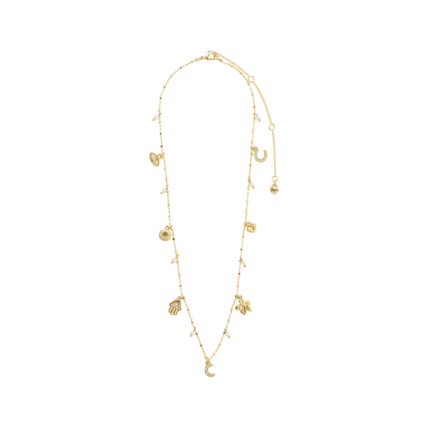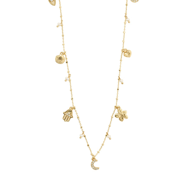 Make today special with the PRUCENCE necklace from Pilgrim - a treasure trove of charming symbolism. The gold-plated chain is sprinkled with small charms, each telling a story. From the warmth of the heart and the beauty of flowers and the mystery of the moon to the horseshoe symbolizing happiness. The Hamsa, seashell and all-seeing eye add a fairytale dimension to your look, while tiny freshwater pearl and sparkling Preciosa crystals add a touch of elegance. Wear a universe of symbolism around your neck and feel connected to the wonders of the world. Designed with a comfortable length of 38 cm plus a 9 cm extension chain. Made from 90% recycled material, the PRUCENCE necklace is not just a piece of jewelry - it's a celebration of life