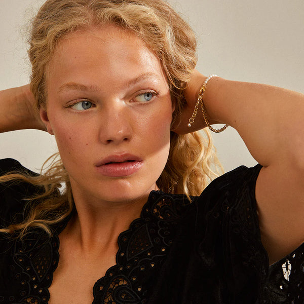 Gold plated bracelet with white beads give a light and romantic feel, combined with a chunky curb chain that adds attitude and an urban edge.