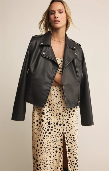 Cut in luxe satin with a flowing midi length, this printed dress balances elegance with ease. Adjustable straps make it wearable from day to night. Add a leather jacket and boots for a modern look.
