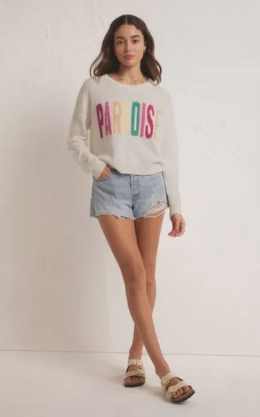 Experience paradise with this lightweight knit, perfect for chilly early mornings. The fun and vibrant paradise lettering adds a touch of summer to your wardrobe.