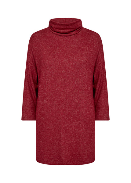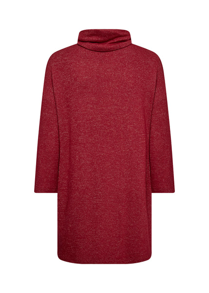 Red turtleneck sweater with 3/4 length sleeve.