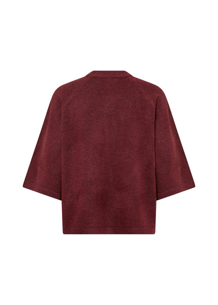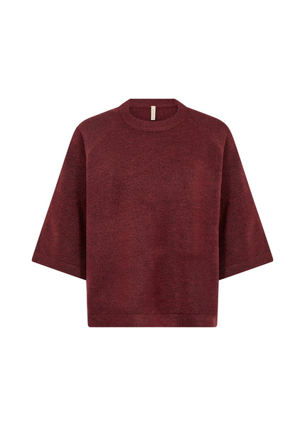 Red sweater pullover features a round neck and 3/4 length wide sleeves.