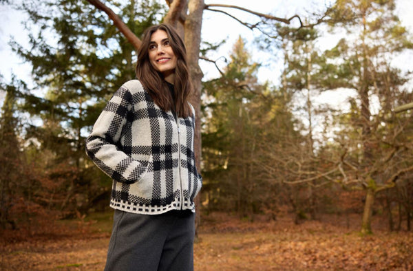 VIBSA 2 Cardigan features a high collar, a zip fastening, a checkered pattern, and finishes at hip length. Pair it with jeans for a relaxed look or layer it over a dress for added warmth and style.