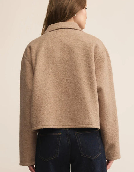 Woman wearing a beige textured cropped utility jacket.