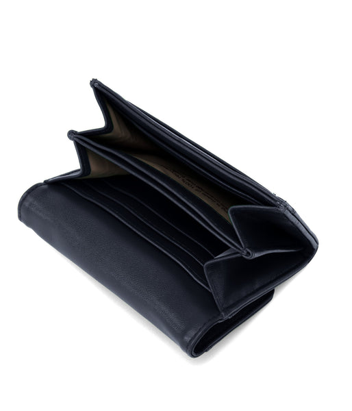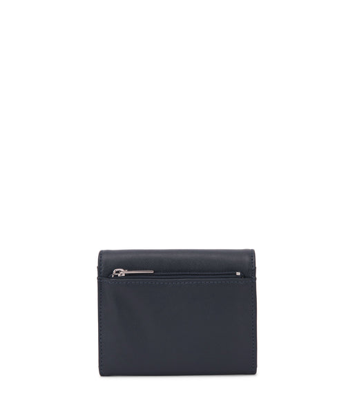 Wallet with a flap closure and a zipper pocket at the back.