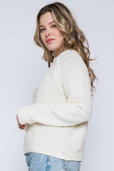 This easy-fit crew neck pullover features a pretty textured stripe knit pattern. Made with a soft cotton blend yarn, it's a perfect elevated basic that you will be reaching for day after day.